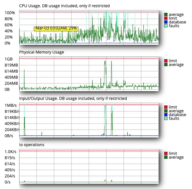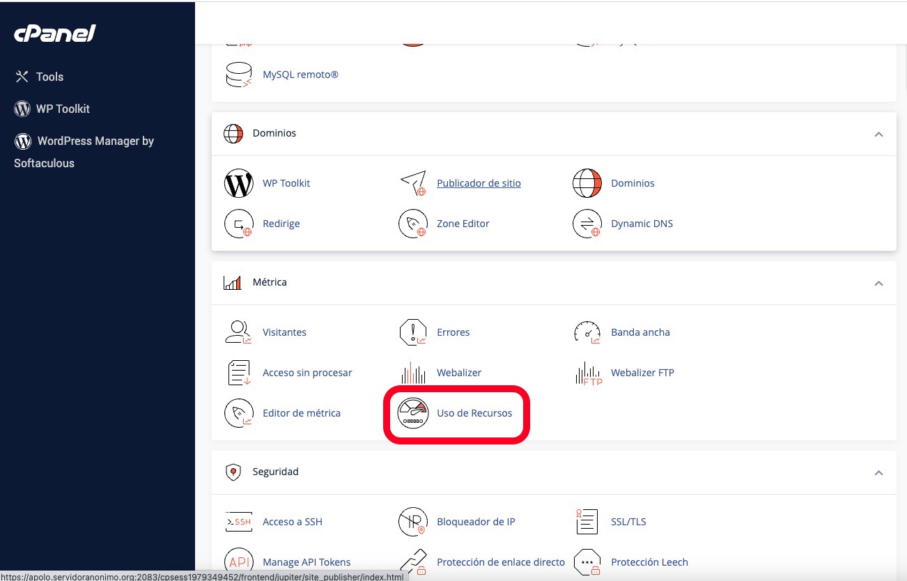 Allí podrás ver algunas estadísticas sobre el consumo de recursos de tu sitio web, tal como se muestra en las imágenes